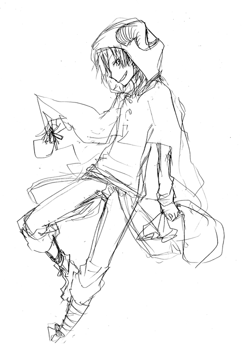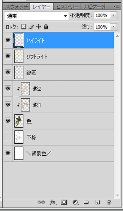 メイキングのようなものまとめ メモ帳 2012年10月07日 ついぴくでしこしこやってたメイキングをまとめてみるよ!つづきからだよ!画像いっぱいで縦長なので注意だよ!本日の使用アイテム・愛用のシャープペン(105円)・コピー用紙(A4)・AdobePhotoshopCS4・ペンタブ・スキャナやってると自分の作業工程が整理できるのでとても良かったです。みんなやればいいよ *①下絵コピー用紙にシャープペンでゴリゴリした下絵をスキャナで取り込み。この後下絵レイヤの不透明度下げ→その上に新規レイヤを作成し線画を描いていきます。この際、下絵レイヤの不透明度を下げると背景が市松模様になるので、一番下に白で塗りつぶしたレイヤを仕込みます。②線画手直ししつつガリゴリグレゴリ。薄く見えてるのが先ほどの下絵。下絵からの主な変更点として、角が変形し左の足先が追加されました。③下塗りパーツごとにレイヤ分けなんて器用なことをするはずもなく色塗りに使うのはレイヤ一枚です。線画の下に通常レイヤを作成して、ペンと消しゴムでべたべたするだけのささやかなおしごと③影1下塗りレイヤの上に新規レイヤを作成、モードは「乗算」。右クリメニューから「クリッピングマスク」を選択して、奥行きになる影を入れます。この時点でなんかそれっぽくなるのでもうこれでいいんじゃないかなって思ったりもします。④影22も1と同様のレイヤで。肌と髪以外はちょっと赤みがかったグレーでゾリゾリ影付けです。⑤仕上げ・「通常」レイヤ追加→ハイライト入れ用。アトレーは目のハイライトを入れませんが髪とか角とか服とか角とか。・「ソフトライト」レイヤ追加+不透明度下げ→フードの端など、一部に黄色を入れてマイルド化。で、これにて完成。日によって加工の程度や影の付け方は変わりますけどだいたいこんなんです。制作時間は下絵も含めると3、4時間くらいのはず今回の使用レイヤ8枚の皆さん PR